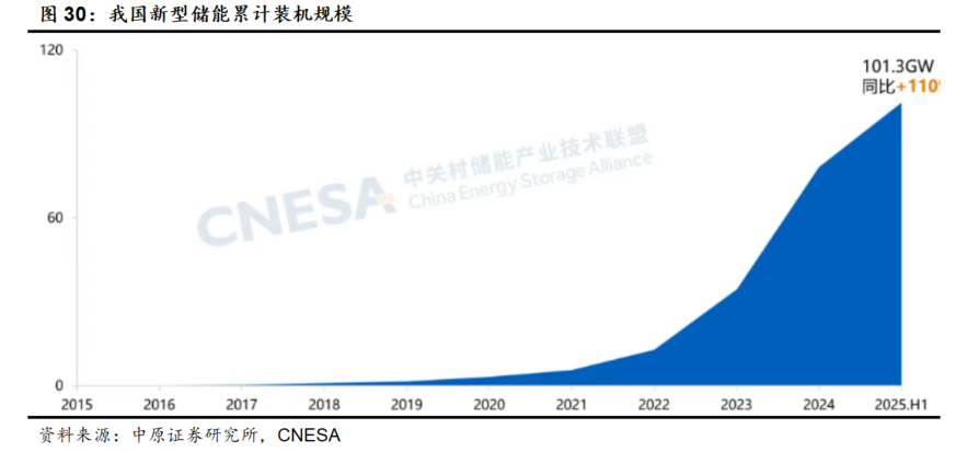 2024年,我国新增新型储能装机容量42.5GW/107.1GWh,同比增长109.5%,单一年度增量占新型储能总装机量的57.7%,增速水平远超预期。截至2024年底,我国新型储能总装机容量达到78.5GW/185.7GWh,同比增长130%,且我国新型储能总装机容量超越抽水蓄能,逐步完成从补充性技术向主力调节资源的转型。技术路线上,磷酸铁锂装机容量约占89%,持续处于主导地位,与此同时液流电池、钠离子电池、飞轮储能等技术路径也已实现产业化突破。2025年上半年,新增投运新型储能项目装机规模23.03GW/56.12GWh,功率规模和能量规模同比增长68%。受政策调整影响,5月新增装机刷新历年月度装机新高,达到10.25GW/26.03GWh,同比增长462%/527%。截至2025年上半年,中国新型储能累计装机规模达到101.3GW,同比增长110%,首次突破100GW,累计装机规模是“十三五”时期末的32倍。