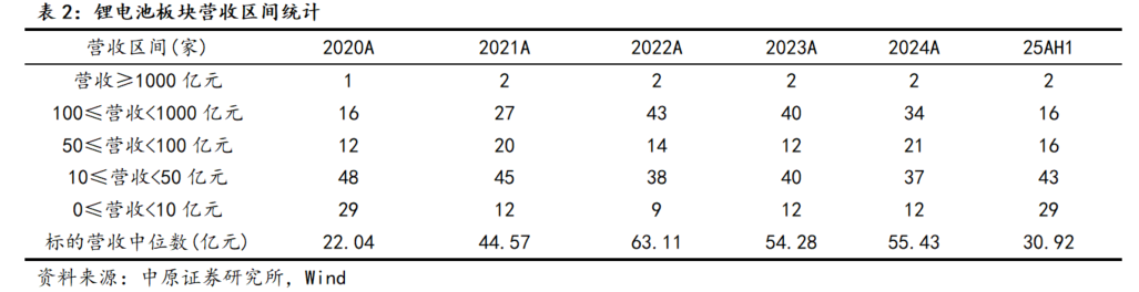 板块归母净利润区间统计显示:归母净利润中位数波动较大,总体与板块净利润趋势一致,其中2022年5.23亿元为近年来的最高值,2022年归母净利润亏损仅7家。2023年以来,归母净利润超过100亿元的稳定在2家,而亏损企业数则较高,2024年和2025年上半年分别为41和36家,显示板块标的业绩显著分化。2020年以来,宁德时代规模净利润稳居行业第一,2024年归母净利润为507.45亿元,2025年上半年为304.85亿元。