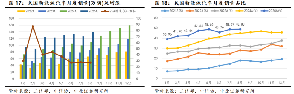 2025年1-8月,我国新能源汽车合计销售959.20万辆,同比增长36.37%,合计占比45.47%,增速较2024年略有提升,新能源汽车销售占比较2024年提升4.55个百分点。我国新能源汽车销售持续高增长,一方面在于新能源汽车整车性价比持续提升,叠加智能化下沉导致新能源汽车消费体验提升;其次动力电池成本下降、新能源汽车轻量化等技术持续进步,行业竞争加剧导致新能源整车价格持续下降;第三,政策层面持续鼓励汽车消费。2025年1月8日,国家发改委和财政部发布了《关于2025年度加力扩围实施大规模设备更新和消费品以旧换新政策的通知》,明确对符合要求的新能源汽车给予一定的补贴,同时部分省市也出台了以旧换新的相关政策,如深圳市对符合要求的新能源乘用车补贴2万元/台。2025年3月,交通运输部办公厅等三部门印发《2025年新能源城市公交车及动力电池更新补贴实施细则》。其中提到,利用超长期特别国债资金,对城市公交企业更新新能源城市公交车及更换动力电池,给予定额补贴。鼓励结合客流变化、城市公交行业发展等情况,合理选择更换的新能源城市公交车辆车长类型。每辆车平均补贴8万元;其中,对更换动力电池的,每辆车平均补贴4.2万元;各地根据更新车辆和更换动力电池的需求情况和数量比例,自主确定更新新能源城市公交车的补贴标准。8月4日,财政部等联合印发《个人消费贷款财政贴息政策实施方案》,旨在通过财政贴息降低居民消费信贷成本,促进消费增长。9月12日,工信部等八部门联合印发《汽车行业稳增长工作方案(2025-2026年)》,提出2025年汽车销量3230万辆左右,同比增长约3%,新能源汽车销量1550万辆左右,并部署多项切实举措:25个公共领域车辆电动化试点城市,将新增推广新能源公交、物流配送等车辆70万辆以上;持续开展新能源汽车下乡及县域充换电设施补短板试点,落实新能源汽车购置税、车船税减免优惠,深化车险改革;加力扩围实施汽车以旧换新政策,支持新能源公交车及动力电池更新。