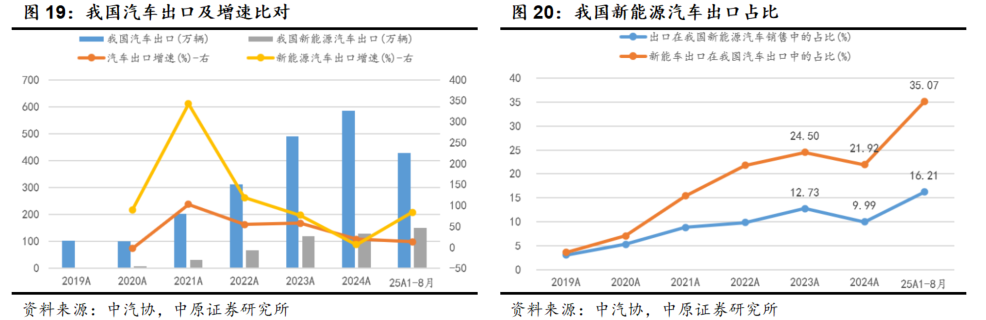 近年来我国汽车出口持续增长,并于2023年和2024年连续两年成为全球最大的汽车出口国。2023年,我国汽车企业合计出口491万辆,同比增长57.83;2024年累计出口585.9万辆,同比增长19.33%;2025年1-8月出口429.2万辆,同比增长13.7%。我国新能源汽车出口在2020-2023年持续高增长,其中2023年出口120.30万辆,同比增长77.17%;2024年出口128.4万辆,同比增长6.73%,增速回落主要受欧洲等贸易保护影响;2025年1-8月出口150.50万辆,同比增长83.76%。我国新能源汽车出口在我国新能源汽车销售中的占比总体持续提升,2019年占比3.07%,2023年提升至12.73%,2024年回落至9.99%,2025年1-8月大幅提升至16.21%,为近年来的新高,显示出口已成为推动我国新能源汽车销售的重要因素。伴随新能源汽车出口增长,新能源汽车出口在我国汽车出口中的占比也持续提升,其中2024年占比21.92%,2025年1-8月大幅提升至35.07%。伴随我国新能源汽车竞争力提升,以及我国新能源车企全球布局产能的逐步释放,预计我国新能源汽车出口仍将高增长,在我国汽车出口和我国新能源汽车销售中的占比将持续提升。