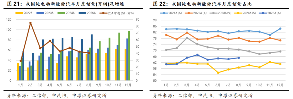 我国新能源汽车销售总体持续以纯电动为主,但纯电动占比回落:2023年纯电动合计销售655.46万辆,同比增长24.31%,合计占比70.54%;2024年合计销售771.5万辆,同比增长15.94%,纯电动合计占比60.0%;2025年1-8月累计销售615.80万辆,同比增长47.25%,纯电动合计占比64.20%,占比较2024年提升4.20个百分点。结合我国新能源汽车发展战略和历史占比,总体预计2025年我国纯电动占比将持续维持高位。