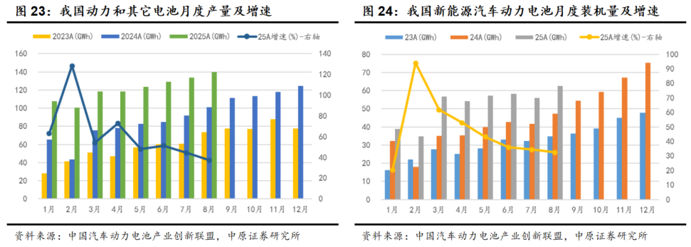 根据中国汽车动力电池产业创新联盟数据统计:伴随我国新能源汽车高增长及锂电产业链总体竞争优势,我国动力电池产量和新能源汽车动力电池装机量持续增长。2024年,我国动力和其他电池累计产量1096.80GWh,累计同比增长40.96%。2025年1-8月,我国动力和其他电池累计产量970.70GWh,累计同比增长54.30%,增速较2024年显著提升。