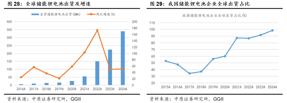 近年来,我国储能锂电池企业全球出货占比总体持续提升:2023年,我国储能锂电池企业全球出货占比91.56%,2024年占比大幅提升至98.53%,同比显著提升6.97个百分点,主要系我国锂电产业链优势显著,产能持续扩大行业竞争加剧导致储能锂电池价格持续下滑。值得关注的是,美国关税政策将对美国市场储能出口产生一定负面影响,不排除短期我国储能锂电池出货占比回落,如关税政策超预期也将影响全球储能锂电池出货。