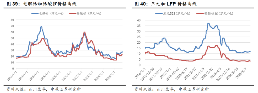 2021年,三元和LFP价格总体大幅上涨。2022年以来,二者价格总体震荡向上,并于2022年11月见顶后总体显著回落,截至2025年9月19日:三元523和LFP价格分别为11.94万元/吨和3.48万元/吨,分别较2025年初上涨11.54%和下降1.97%,后续重点关注碳酸锂和电解钴价格走势。碳酸锂是正极材料、六氟磷酸锂和电解液等主要成本之一,其价格走势与相关材料价格高度正相关。