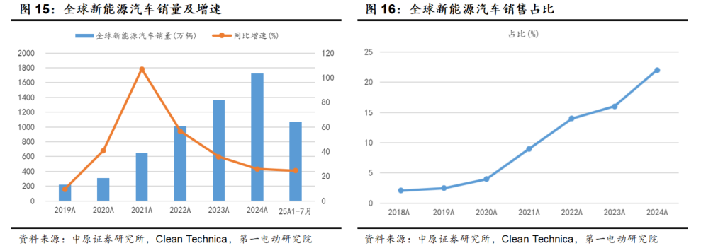 根据Clean Technica和第一电动研究院统计数据:2023年,全球新能源汽车销售1368.58万辆,同比增长35.84%,占整体市场16%份额(其中纯电动车型占比为11%)。2024年,全球新能源汽车合计销售1724.16万辆,同比增长25.98%,占比22%。