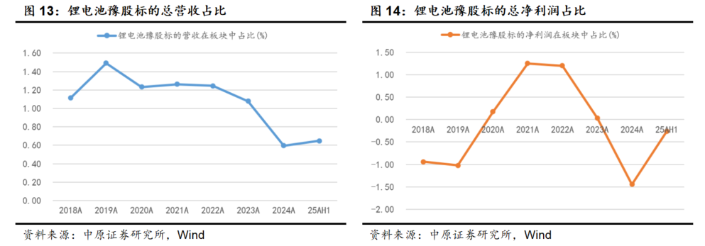结合豫股锂电池标的数量占比,以及锂电池豫股标的总营收和总净利润在锂电池板块总营收和总净利润中的占比,可以得出如下结论:一是豫股锂电池标的营收和净利润规模总体均较小,无论总营收还是总净利润占比,均显著低于豫股锂电池标的数量占比。二是总营收占比方方面总体在1.1%左右波动,其中2019年占比1.49%,2024年为0.59%,显著偏离近年来的均值,2025年一季度小幅提升至0.66%,2025年上半年回落至0.65%。三是总净利润占比大幅波动,与豫股锂电池总净利润部分年度亏损相关,其中2021年占比1.26%,而2024年为-1.44%,2025年一季度为-0.07%,上半年回落至-0.26%,但环比2024年有所改善。