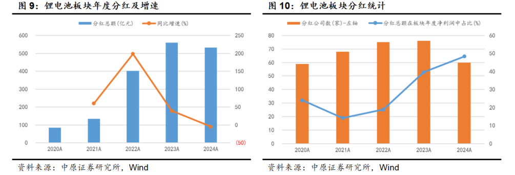 综上,锂电池板块上市公司总体注重分红,分红在净利润中的占比总体持续提升,其中龙头公司分红贡献显著。