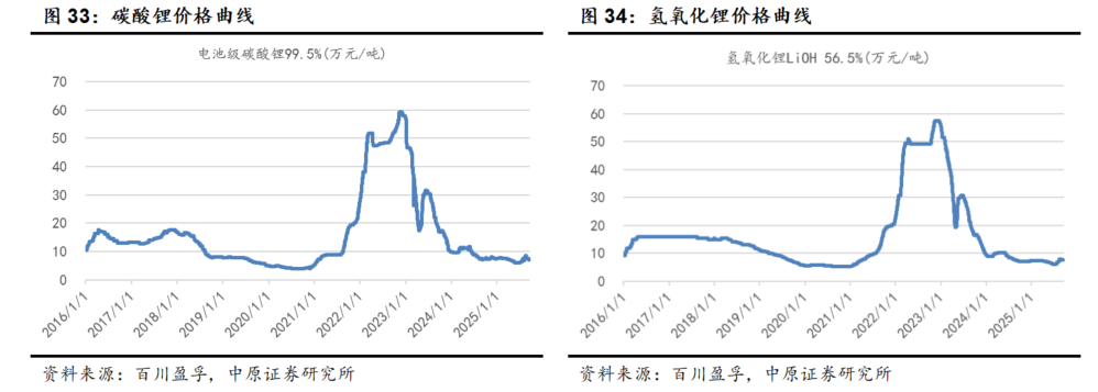 具体看主要材料产品价格情况。碳酸锂和氢氧化锂价格在2021年高增长,2022年持续大幅上涨。碳酸锂和氢氧化锂价格总体于2022年12月见顶以来持续回落,2023年以来总体持续承压,截至2025年9月19日:电池级碳酸锂价格为7.25万元/吨,较2025年初下跌4.28%;氢氧化锂价格7.68万元/吨,较2025年上涨5.28%。值得关注的是,受国家综合整治内卷影响,碳酸锂及相关材料价格表现出现一些积极因素。电池级碳酸锂2025年以来最低和最高价格分别为5.95万元/吨和8.65万元/吨,最高价相比最低价上涨45.38%,价格上涨主要原因为8月9日宁德时代旗下枧下窝矿区采矿许可证到期停产,行业供需错配预期得以改善,后续仍需积极关注江西其它7宗锂资源矿权相关进展,以及宁德时代下枧下窝矿区复产进度。其中,4月下旬以来,碳酸锂价格快速从7万元/吨跌破最低至5.95万元/吨,短期价格下跌主要动力来自海外锂矿价格的快速下降,同时进口碳酸锂显著放量,如4月22日,澳矿CIF报价795美元/吨,非洲矿价格741美元/吨;5月20日,澳矿CIF报价却下跌至657.5美元/吨,非洲矿价格跌至625美元/吨,跌幅分别达到17.36%和15.65%,大于锂价平均下跌幅度。电池级碳酸锂制备主要包括盐湖提锂和矿石提锂,就矿石提锂而言其产品价格影响因素众多,主要包括上游锂矿企业、矿石碳酸锂生成企业、碳酸锂贸易企业、锂电池制备企业及下游新能源整车等。