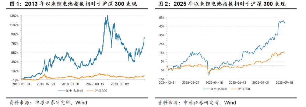 根据万得数据统计:2013年以来,锂电池板块最高涨幅约14倍,于2021年11月底见顶。2024年,锂电池板块下跌6.09%,而沪深300指数上涨16.20%,锂电池指数走势显著弱于沪深300指数。2025年以来,锂电池板块走势总体与沪深300指数趋同,截至9月19日:锂电池板块指数上涨48.12%,同期沪深300指数上涨14.41%,锂电池板块跑赢沪深300指数33.71百分点。
