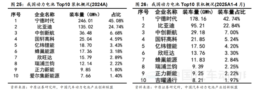 我国动力电池装机行业集中度总体较高,2024年Top10市场合计占比95.6%,2025年1-8月为94.4%,总体仍维持在较高水平。动力电池集中度提升,将导致上游材料行业集中度提升,长期注重技术创新、具备显著规模和成本优势企业将受益于行业增长。