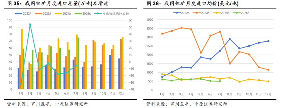 碳酸锂是正极材料、六氟磷酸锂和电解液主要成本之一,其价格走势与相关材料价格高度正相关。锂矿是碳酸锂上游原材料,2023年我国进口锂矿646万吨,同比增长53.56%;2024年进口810万吨,同比增长25.34%;2025年1-7月进口425万吨,同比回落9.71%。2024年,锂矿月度进口均价同比显著回落,2025年锂矿进口均价总体持续回落。预计全年锂矿进口量总体将增长,且价格中枢将下降。