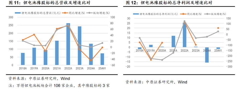 板块业绩改善,豫股锂电池合计业绩占比低。2024年,锂电池板块营收2.25万亿元,同比略增0.07%;净利润1101.4亿元,同比下降22.02%。2025年上半年,板块营收1.14万亿元,同比增长13.78%,正增长公司占比67.92%;净利润679.5亿元,同比增长28.07%,正增长公司占比59.43%。豫股锂电池合计3家标的,标的数量在锂电池板块中占比2.83%;豫股锂电池营收和净利润规模总体较小,其中豫股锂电池总营收占比在1.1%左右波动、而净利润波动较大,2024年豫股锂电池总营收同比下降44.85%,净利润亏损;2025年上半年总营收下降1.15%,净利润持续亏损。