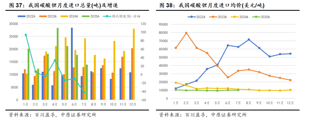 碳酸锂进口方面,2023年合计进口15.87万吨,同比增长16.65%;2024年进口23.50万吨,同比大幅增长48.0%,增速较2023年显著提升;2025年1-7月进口13.16万吨,同比增长0.81%。碳酸锂进口价格方面,2024年进口价格总体较2023年显著回落,2025年以来持续回落,但跌幅趋缓,其中2025年2月、5月和7月进口均价均跌破1万美元/吨,5月9392美元/吨为年度最低。考虑我国锂电产业全球竞争优势,以及结合海外碳酸锂成本及产能释放预期,总体预计进口量仍将增加,进口均价中枢将持续下降。