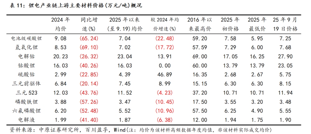 根据百川盈孚和万得数据统计:2023-2024年,上游主要原材料价格总体持续承压;2025年以来,主要原材料价格表现差异化,其中碳酸锂高度相关材料价格总体仍承压,但在内卷综合整治影响下出现一些积极因素,而钴相关产品价格受外部政策影响显著反弹。
