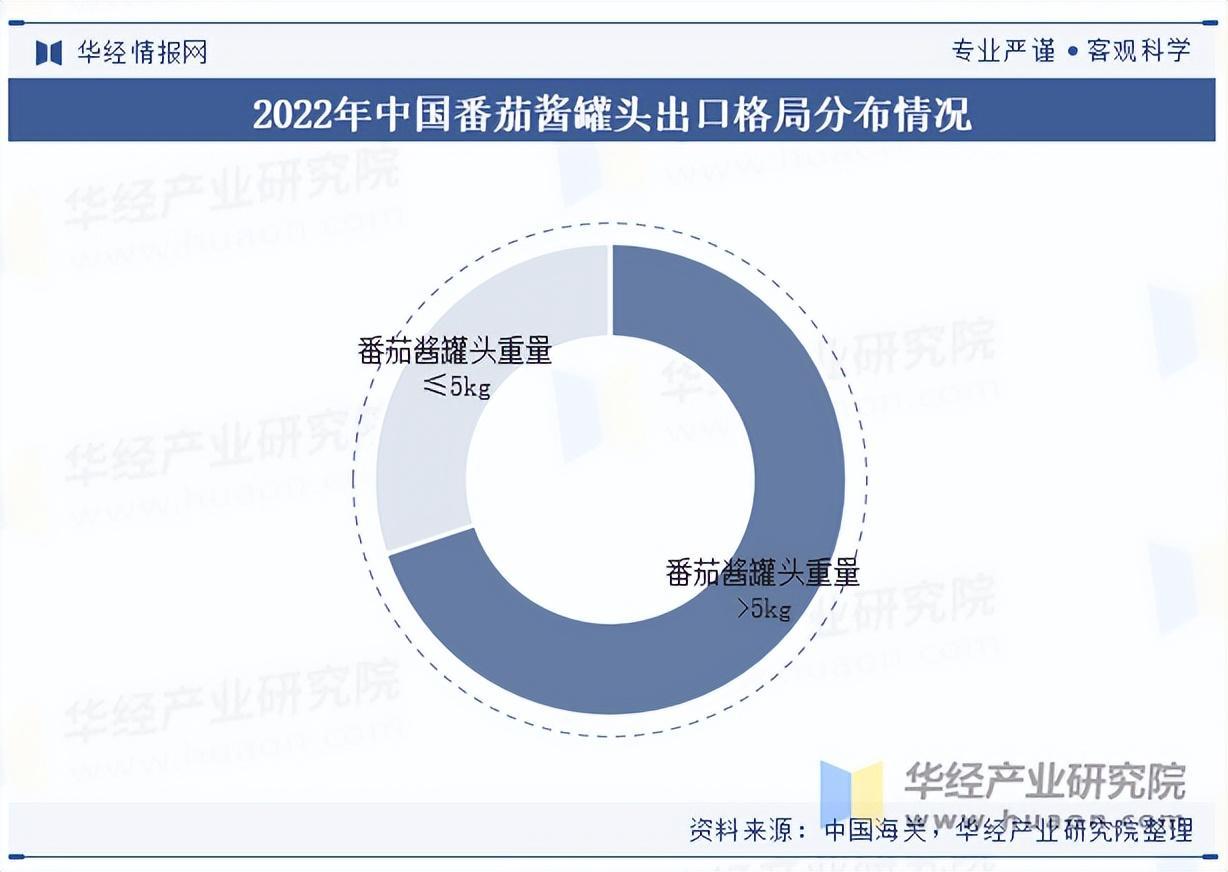 商务部对外贸易司在一份关于“番茄酱”的《中国农产品出口产品指南》中提到,番茄酱是中国出口量最大的番茄制品,分为大罐原料酱(重量大于5千克)和小罐番茄酱(重量小于或等于5千克)。细分来看,重量>5kg的大包装番茄酱罐头出口占比较大,出口数量占比为69.9%,重量≤5kg的小包装番茄酱罐头的出口数量的比重则是30.1%。