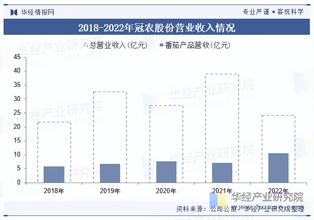 新疆冠农股份有限公司成立于2012年10月,连续七届蝉联农业产业化国家重点龙头企业,荣获全国农产品加工百强企业、国家功能食品工程技术研究中心“番茄综合精深加工关键技术研究及产业化基地”等荣誉和资质。目前,冠农股份番茄丁的国内市场占有率突破60%,番茄产品国内市场销售额占总销售额比例由不到10%提升到30%。2022年,冠农股份的总营业收入为24.13亿元;其中,番茄产品实现营收10.54亿元,毛利率为18.83%。