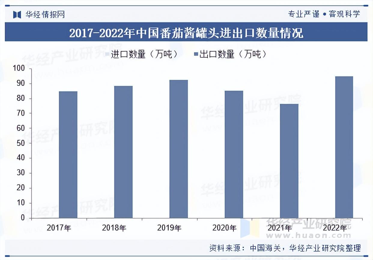 近年来,我国番茄酱罐头等加工制品行业贸易以出口外销为主,整体市场易受国际行情影响而呈现一定的周期性波动。2022年,中国番茄酱罐头进、出口数量分别为0.08万吨、94.92万吨,贸易顺差加大;因受极端天气扰动、地缘冲突升级、能源成本增加等因素影响,2022年多国工业番茄生产量同比下滑,2023年产量恢复进度偏慢,海外尤其是欧洲地区番茄制品生产成本高增、产量下降。