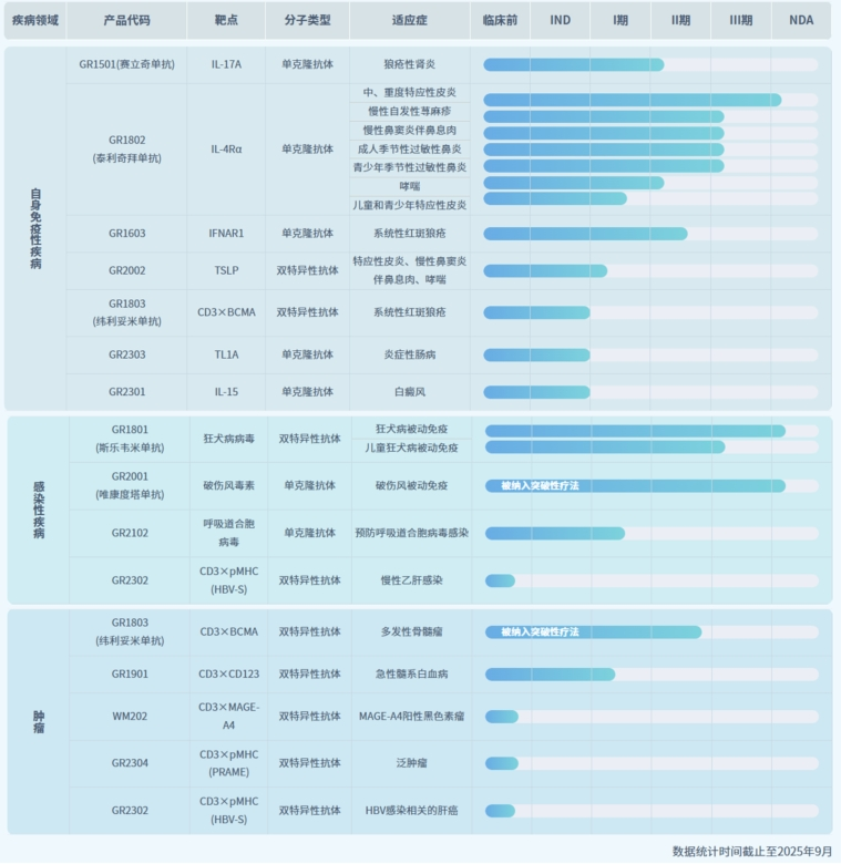 在肿瘤领域,公司依托双抗技术平台积极布局,其中GR1803已获得突破性疗法认定,部分管线已进入临床前研究。