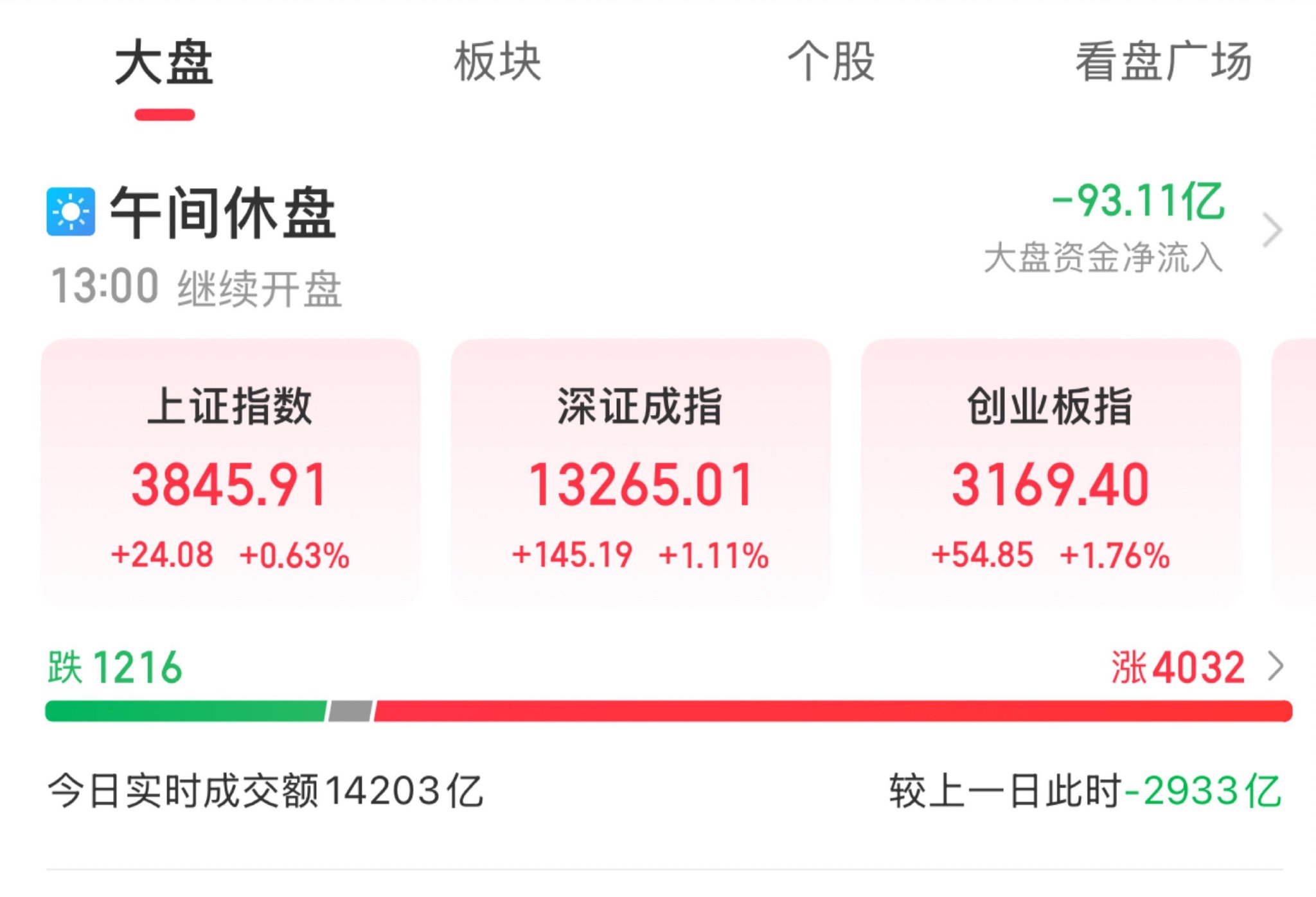 A股三大指数早盘集体上涨,截至午盘,上证指数涨0.63%,深成指涨1.11%,创业板指涨1.76%,北证50涨1.25%,科创50指数涨4.94%。沪深京三市半日成交额14203亿元,较上日缩量2933亿元。全市场超4000只个股上涨。