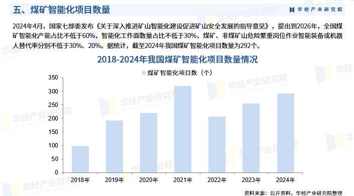 2024年4月,国家七部委发布《关于深入推进矿山智能化建设促进矿山安全发展的指导意见》,提出到2026年,全国煤矿智能化产能占比不低于60%,智能化工作面数量占比不低于30%,煤矿、非煤矿山危险繁重岗位作业智能装备或机器人替代率分别不低于30%、20%。据统计,截至2024年我国煤矿智能化项目数量为292个。