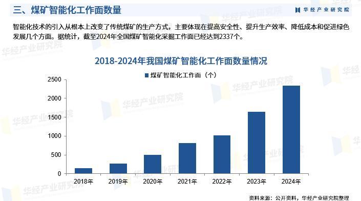 智能化技术的引入从根本上改变了传统煤矿的生产方式,主要体现在提高安全性、提升生产效率、降低成本和促进绿色发展几个方面。据统计,截至2024年全国煤矿智能化采掘工作面已经达到2337个。