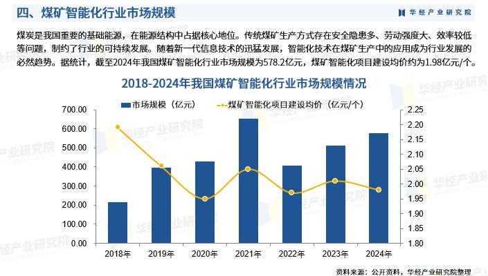 煤炭是我国重要的基础能源,在能源结构中占据核心地位。传统煤矿生产方式存在安全隐患多、劳动强度大、效率较低等问题,制约了行业的可持续发展。随着新一代信息技术的迅猛发展,智能化技术在煤矿生产中的应用成为行业发展的必然趋势。据统计,截至2024年我国煤矿智能化行业市场规模为578.2亿元,煤矿智能化项目建设均价约为1.98亿元/个。