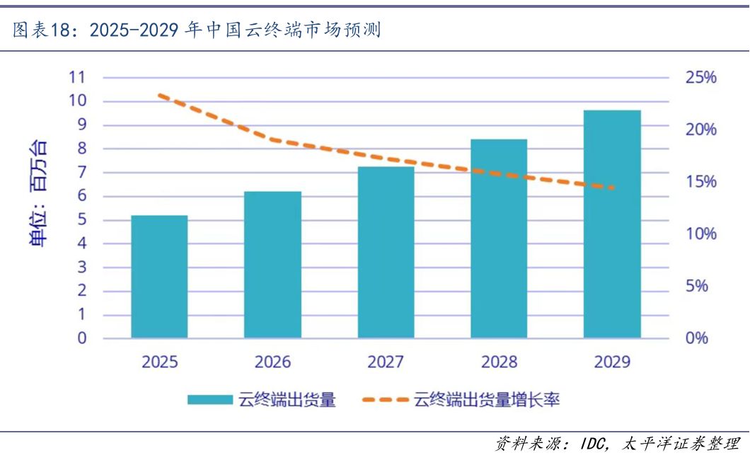 中国云终端市场规模保持持续增长。据IDC数据,2024年中国云终端市场总出货量达421.7万台,同比增长40.0%。预计到2029年,市场规模将突破962万台,五年复合增长率高达16.6%。公有云部署拉动消费类云终端增长,以及新定义下云终端市场硬件设备拓展到除手机、电脑以外的平板、电视、机顶盒以及车机等,促进云终端市场积极表现。