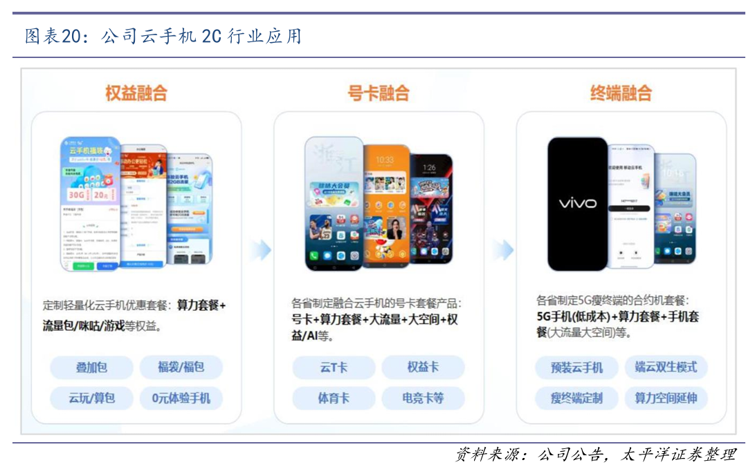 针对C端市场推出运营商面向个人用户的云手机。公司基于华为云研发的云手机产品被中国移动采用并向2C市场推出,面向游戏用户、隐私用户、多终端用户等运营商广大客户,是运营商5G方向2C应用战略的重要产品。公开数据显示该产品2024年用户规模破千万,月活用户超260万。公司与运营商还基于云手机基础产品,融合运营商的权益、号卡、瘦终端,推出算力套餐服务产品。
