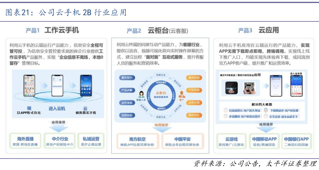 针对B端市场推出行业应用。公司利用云终端的“应用在云上运行和同屏互动”等技术优势,研发了三大2B的行业应用产品。1)工作云手机:针对信息安全要求高的政府、房产经纪、保险经纪、公安等行业,通过企业应用上云,解决企业信息安全的可管可控,终端本地0留存。2)云柜台:面向金融保险、航空等领域,支撑客服和营销两大类业务场景,建立远程“面对面”互动式服务,提升客服人员的服务和营销效率。3)云应用:面向游戏、运营商、金融等领域,通过应用云端预装,只需通过H5链接或扫描二维码的方式就可进入云化APP。