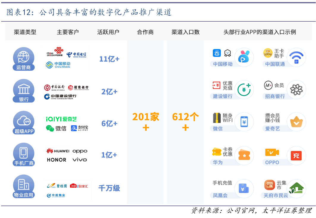 公司凭借多年经验积累了大量的头部客户资源,建立了较高的核心客户壁垒。公司管理层成员多为通信互联网行业老兵,积累了丰富的产业经验和资源。目前,公司已与三大运营商、三家头部网络视频商(爱奇艺、优酷、芒果TV)建立合作关系,并为中国建设银行、中国银行、招商银行、中石化、碧桂园、OPPO手机、VIVO手机等众多大型企业集团的营销、兑换、运营活动直接提供数字化虚拟商品交易及服务解决方案。物联网领域,公司与腾讯联合推出基于物联网技术的智能CPE机顶盒产品。云终端领域,公司是华为云云终端的核心服务提供商,并向中国移动终端公司提供云终端相关服务。