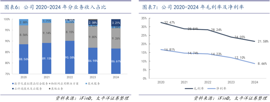 高毛利业务收入快速增长有望带来盈利能力提升。公司2022-2024年综合毛利率分别为28.24%/24.05%/21.58%,毛利率下降主要是由于运营商“提速降费”背景下流量单价下降,同时数字商品聚合运营业务竞争较为激烈,毛利率相对较低。分业务看,2024年公司各大板块毛利率分别为:数字化虚拟商品综合服务(18.67%),物联网应用解决方案(39.97%),云终端技术及云算力运营(41.19%)。2024年物联网应用解决方案业务实现收入1.43亿元,同比+23%;云终端技术与云服务业务实现收入4946万元,同比+102%。随着这两大高毛利业务的收入高速增长,占比逐渐提升,公司整体毛利率有望企稳回升。