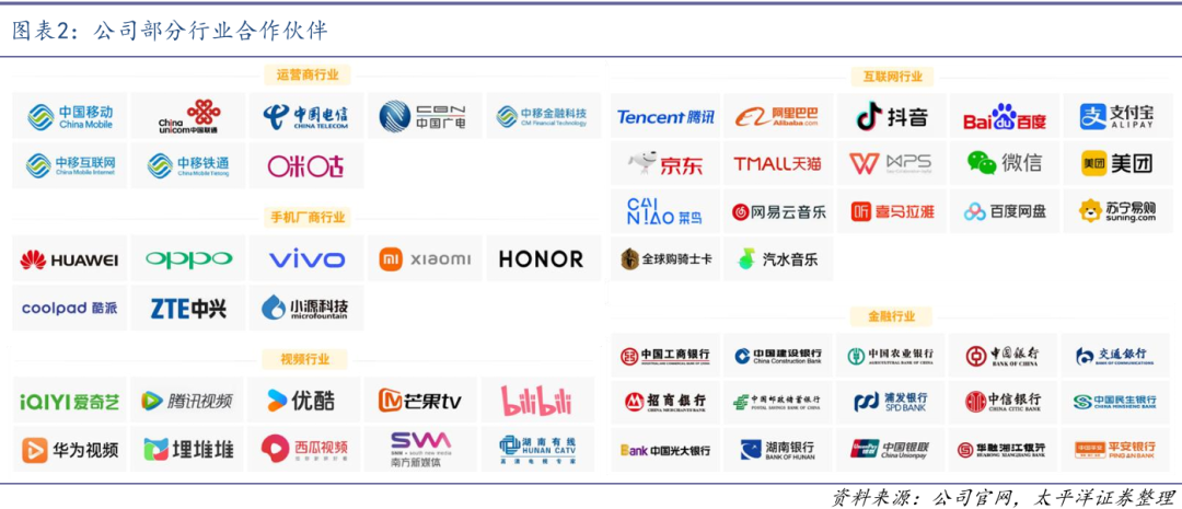 公司凭借多年经验积累了大量的头部客户资源,建立了较高的核心客户壁垒。公司已与数百家多个行业的头部客户建立多年的深度合作关系,包括:三大运营商“中国移动、中国电信、中国联通”,头部互联网企业及品牌“微信、支付宝、腾讯视频、爱奇艺、优酷、芒果TV、字节跳动、美团、金山办公、网易、火山引擎”等,银行客户“中国银行、中国建设银行、工商银行、招商银行、中信银行”等数十家银行,手机厂商“华为、OPPO、VIVO”等,物联网500多家行业客户,包括“萤石、证通电子、友宝、通达电气、新奥燃气、赵一鸣食品、深圳拓邦、上海鹄雀、湖南兴元、湖南中吉”等。云终端技术的合作企业“中国移动、华为云、南方航空、中国银行”等。