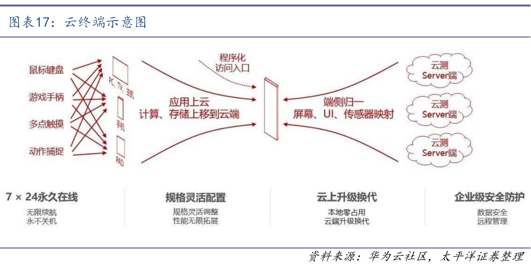根据华为云与中国科学院科技战略咨询研究院智库建设研究部联合发布的《云终端产业发展报告》,“云终端”即以云计算为核心,通过网络将计算、存储、应用、AI能力等资源从本地终端迁移到云端,并在终端设备以流式方式呈现使用体验的新型终端形态。