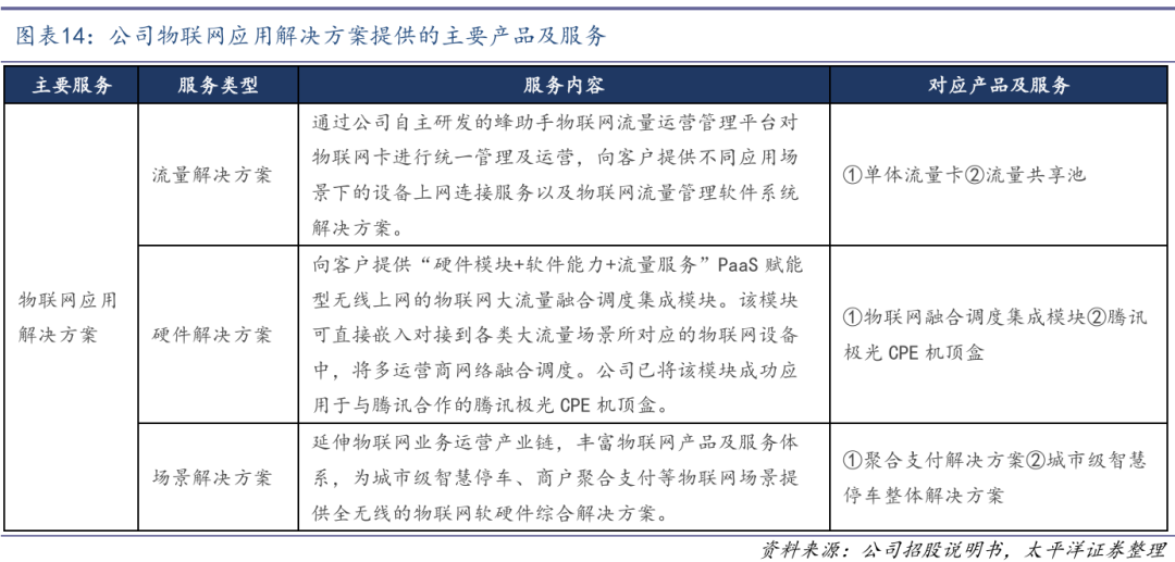 公司以物联网流量运营为核心推出多种硬件及解决方案。公司基于移动互联网数字化虚拟商品综合服务奠定的经营基础、运营经验以及平台技术优势,将业务领域逐渐从移动互联网向物联网延伸,积极布局物联网相关业务。通过构建“流量池运营、模组与多功能主板系列、蜂助手盒子系列、IoT解决方案”四大支柱产品业态,为物联网的广泛应用场景提供包括无线接入、无线宽带组网、硬件集成及定制化场景解决方案在内的综合服务。