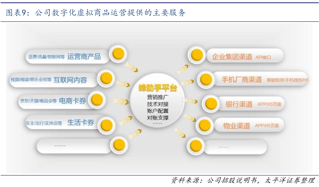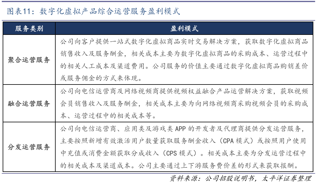公司提供移动互联网数字商品聚合运营、融合运营、分发运营、连续包月的联合产品等综合运营服务。公司平台聚合的数字化虚拟商品资源涵盖运营商产品、视频会员权益、电商购物、生活卡券、旅游出行、车主服务、音乐会员、阅读会员、社交会员、便民服务等数十个领域及行业的数百种互联网数字化虚拟商品。公司针对“长视频平台、音乐平台、WPS办公会员、生活类平台”等行业头部产品签订更多的独家代理产品资源,保障业务的稳定性、业务的规模和毛利率。