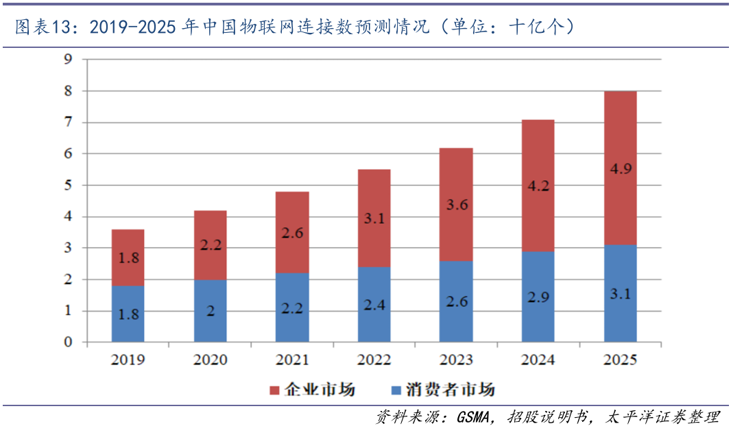 万物互联时代来临,全球物联网终端数量高速增长。根据GSMA的预测,2025年全球物联网终端连接数量将达到250亿个,其中工业物联网终端连接数将达到140亿,消费物联网终端连接数量达到110亿个,占全球连接50%以上。中国市场物联网终端连接情况与全球情况同步,GSMA预测到2025年,企业市场将达到49亿个,占据物联网终端设备连接数一半以上的份额。
