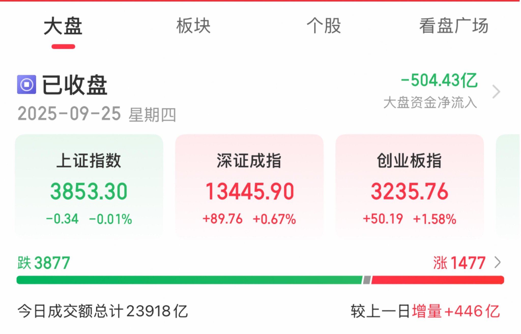 A股三大指数今日涨跌不一,截至收盘,上证指数跌0.01%,深证成指涨0.67%,创业板指涨1.58%,北证50跌1.37%。沪深京三市全天成交额23918亿元,较上日放量446亿元。全市场超3800只个股下跌。