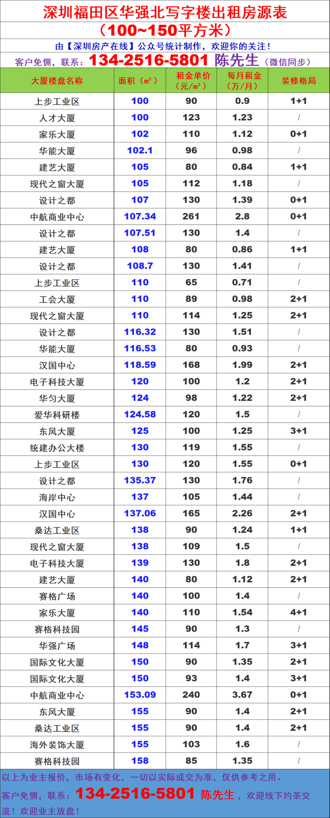 福田区华强北片区写字楼办公室出租房源信息表&租金价格表