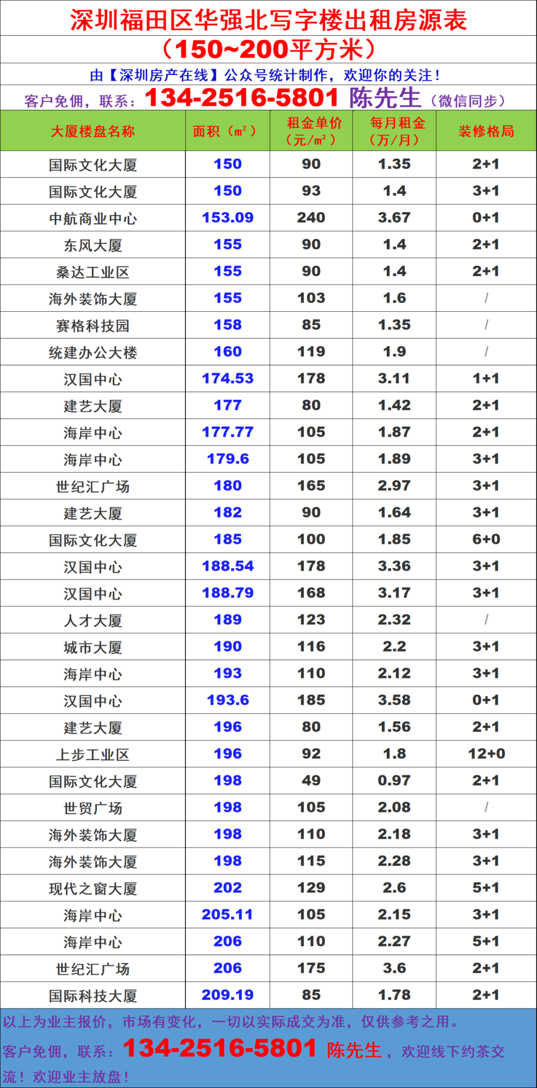 深圳福田区华强北片区150-200平米写字楼出租招租赁信息