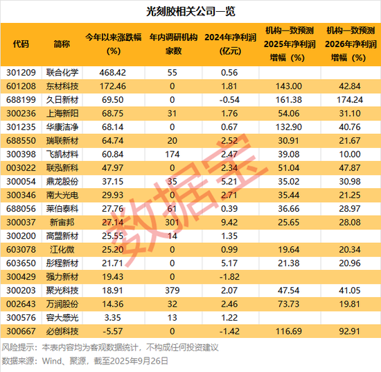 上述20家公司中,根据机构一致预测数据来看,光刻胶产业链公司整体业绩向好。13家公司获机构一致预测2025年、2026年净利润增幅有望持续超过20%,其中有8家年内跑输申万半导体行业指数(50.51%),包括联泓新科、鼎龙股份、南大光电、聚光科技等。