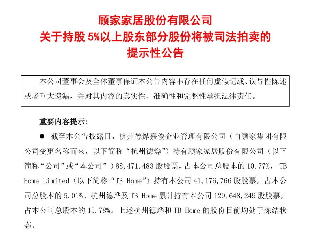 9月22日,顾家家居公告,杭州德烨嘉俊企业管理有限公司和TBHomeLimited持有的公司股份将被司法拍卖。杭州德烨拟被拍卖1389.4961万股,占其持有股份的15.71%,占公司总股本的1.69%;TBHome拟被拍卖1450.87万股,占其持有股份的35.24%,占公司总股本的1.77%。此次拍卖由浙江省杭州市中级人民法院在淘宝网司法拍卖平台进行,拍卖时间为2025年10月23日10时至2025年10月24日10时。