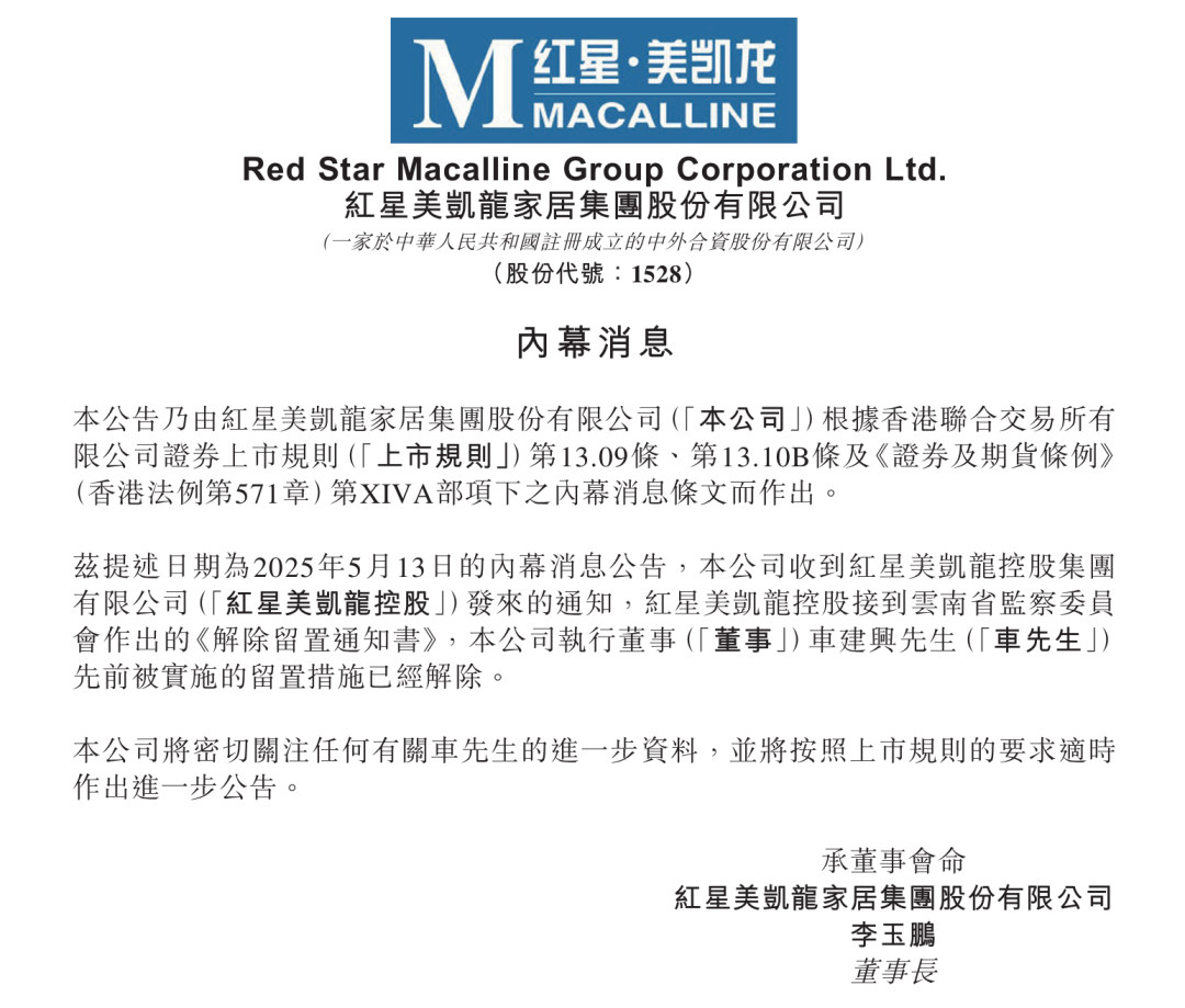 9月22日,红星美凯龙发布公告称,公司实际控制人、董事兼总经理车建兴已被云南省监察委员会正式解除留置措施。这一决定标志着自今年5月以来持续四个多月的调查暂告一段落。据公告披露,车建兴于2025年5月14日因被云南省监察委员会立案调查并实施留置。在此期间,红星美凯龙及其母公司红星控股积极配合调查,公司经营未受重大影响。