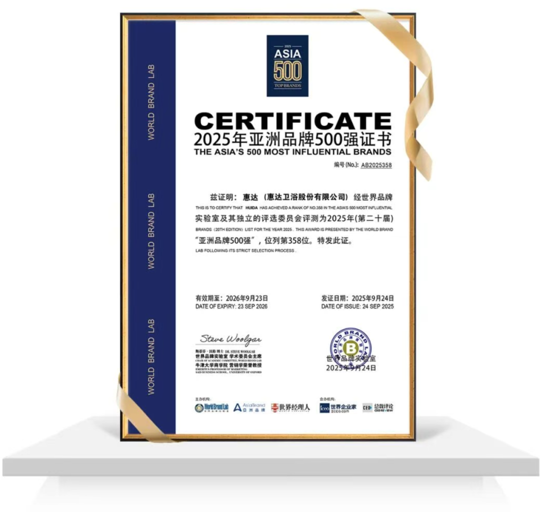 惠达卫浴荣登2025年《亚洲品牌500强》