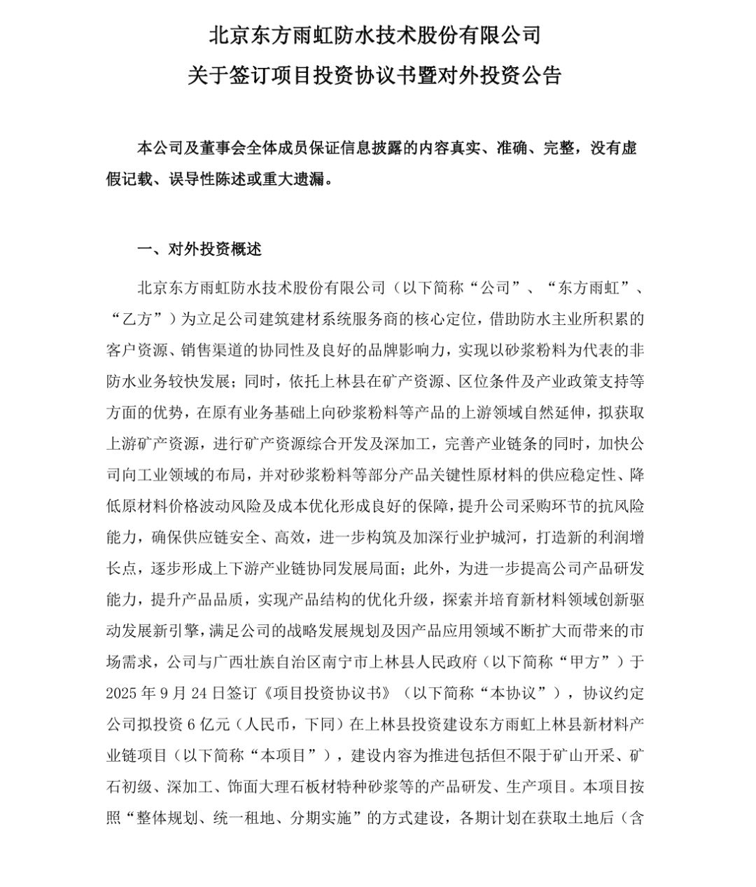 9月26日,东方雨虹发布公告,公司于9月24日与广西壮族自治区南宁市上林县政府签订项目投资协议书,拟投资6亿元在上林县建设东方雨虹上林县新材料产业链项目。据公告显示,此项目预计投资总额6亿元,建成达产后预计平均每年产值约8亿元,年纳税预计0.4亿元。在建设周期方面,各期计划在获取土地(含租赁土地)且土地具备开工条件之日起3个月内开工建设,开工之日起18个月内有产品投产。