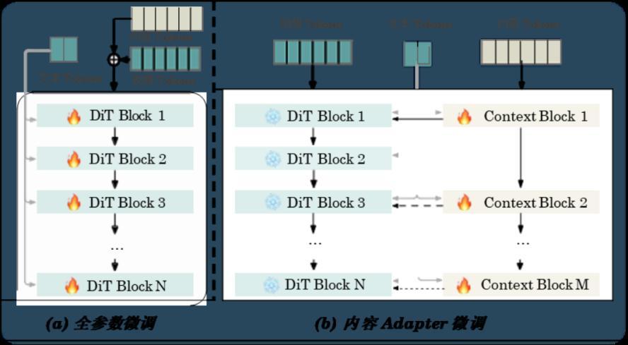 这种方法冻结大模型已有的参数,只对额外添加的 Context Bloc 进行训练。这样做的好处是在不破坏大模型原有知识结构的前提下,能够快速使模型适应新的视频生成下游任务。其具有收敛速度快的特点,并且支持灵活的插件式功能扩展,能够有效应对不同的任务需求。