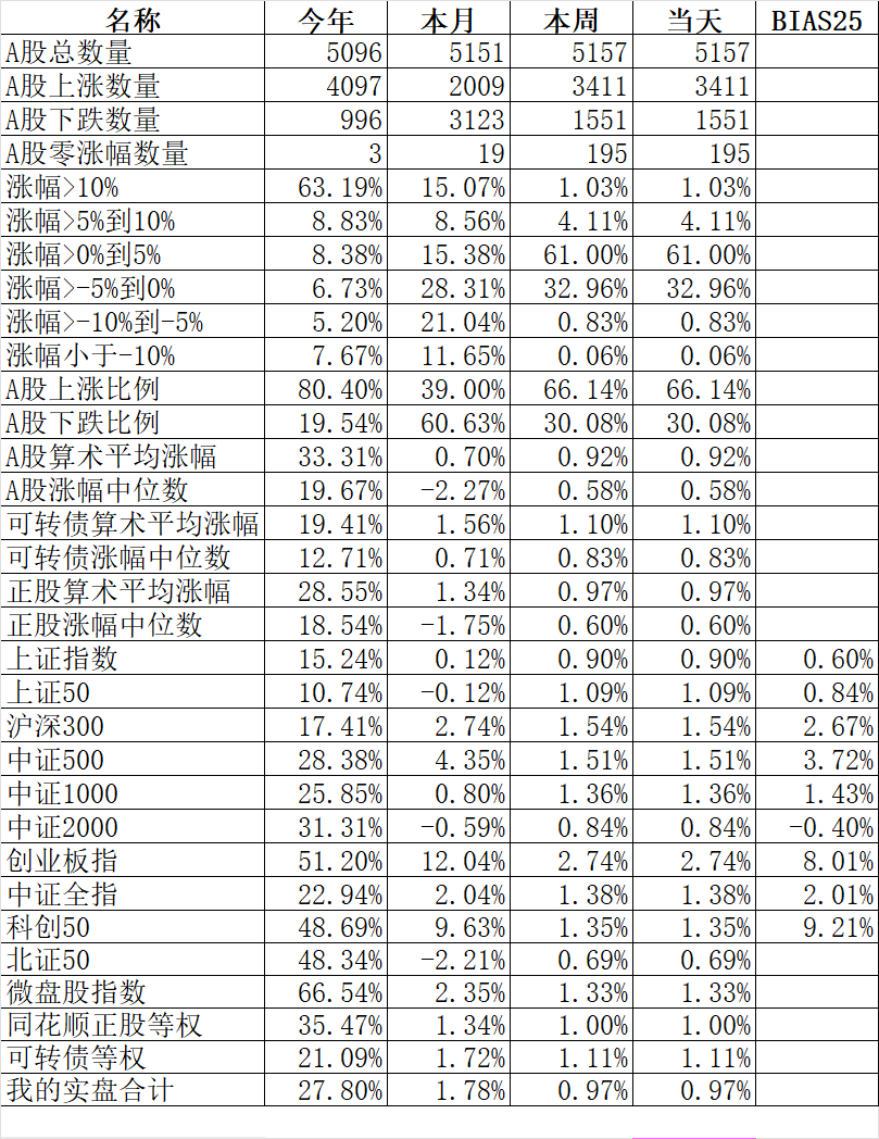 420只可转债平均上涨1.11%,对应正股平均上涨0.98%。我的主仓20只可转债平均上涨0.95%,对应正股平均上涨0.85%。