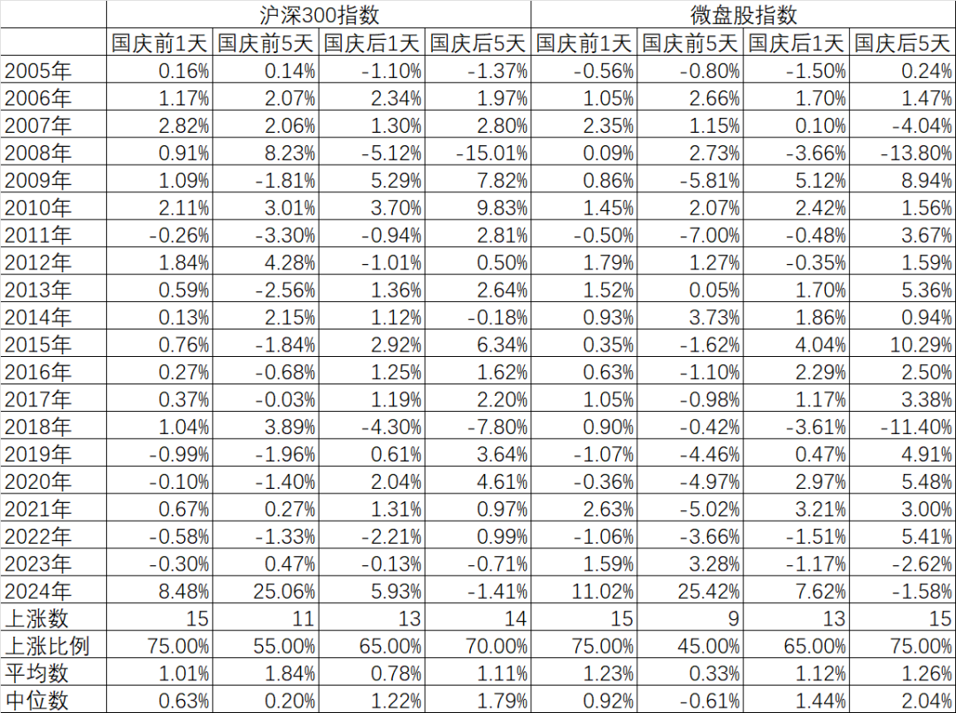 以下统计了从2005年到2024年这20年来代表最大企业的沪深300指数和代表最小企业的微盘股指数在国庆前1天、前5天和国庆后1天,后5天的上涨比例、平均数和中位数: