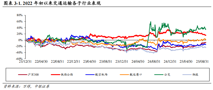 年初至今:2025年初以来,上证综指、沪深300累计涨跌幅分别为+14.21%、+15.63%,交通运输指数-1.34%;交通运输各个子板块来看,铁路公路-11.32%、航空机场-3.95%、航运港口+1.51%、公交+7.13%、物流+8.58%。