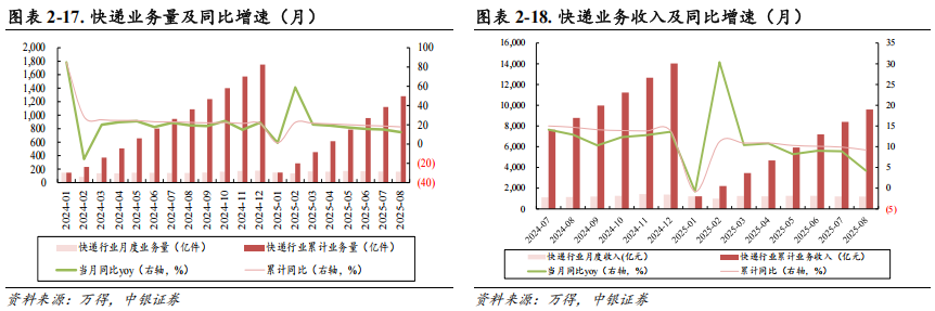 2025年8月快递业务量同比上升12.29%,快递业务收入同比增加4.24%。2025年8月月度快递业务量161.5亿件,同比增加12.29%,环比减少1.52%,快递业务收入完成1189.6亿元,同比增加4.24%,环比减少1.39%;2025年1-8月累计快递业务量1282.0亿件,同比增加17.80%,2025年1-8月快递业务收入9583.7亿元,同比增长9.17%。
