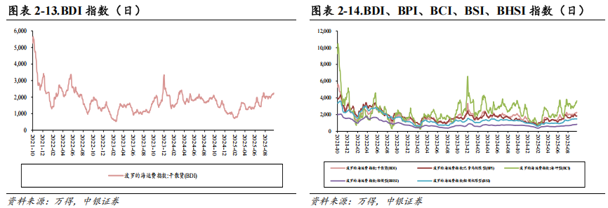 干散货:BDI指数环比上升,报收2203点。2025年9月26日,波罗的海干散货指数(BDI)报收2259点,周环比+2.54%,同比+8.03%,分船型看,巴拿马型、海岬型、轻便型、轻便极限型运价指数分别报收1832/3627/841/1479点,环比-0.70%/+5.53%/+3.19%/-0.67%,同比+22.30%/ +1.31%/+18.12%/+12.56%。我们认为BDI中长期走势需要观察全球工业经济恢复情况,可以持续动态跟踪世界钢铁产量、澳大利亚和巴西铁矿石出口、中国煤炭进口等指标。